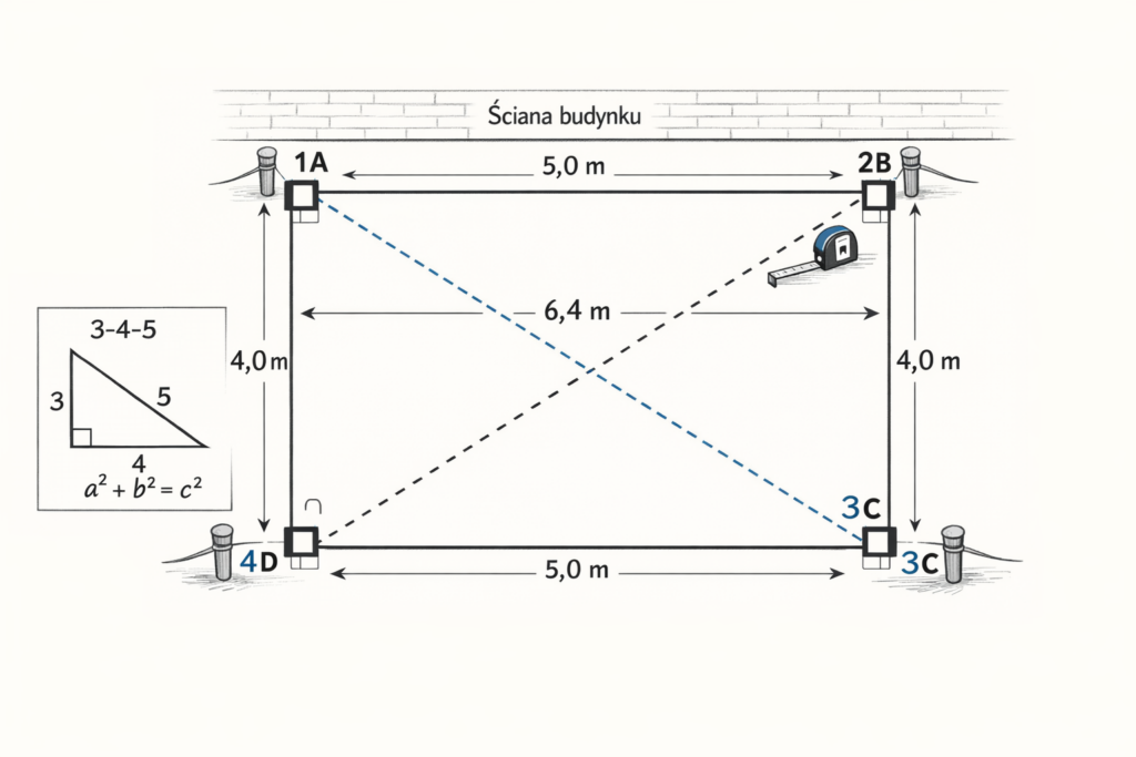 Rozpocznij od wyznaczenia pierwszej krawędzi tarasu przylegającej do ściany budynku. Wbij dwa kołki oznaczające narożniki A i B w odległości odpowiadającej planowanej szerokości tarasu. Ta linia będzie twoim punktem odniesienia – od niej będziesz ustalać pozostałe narożniki z zachowaniem kąta prostego względem domu.